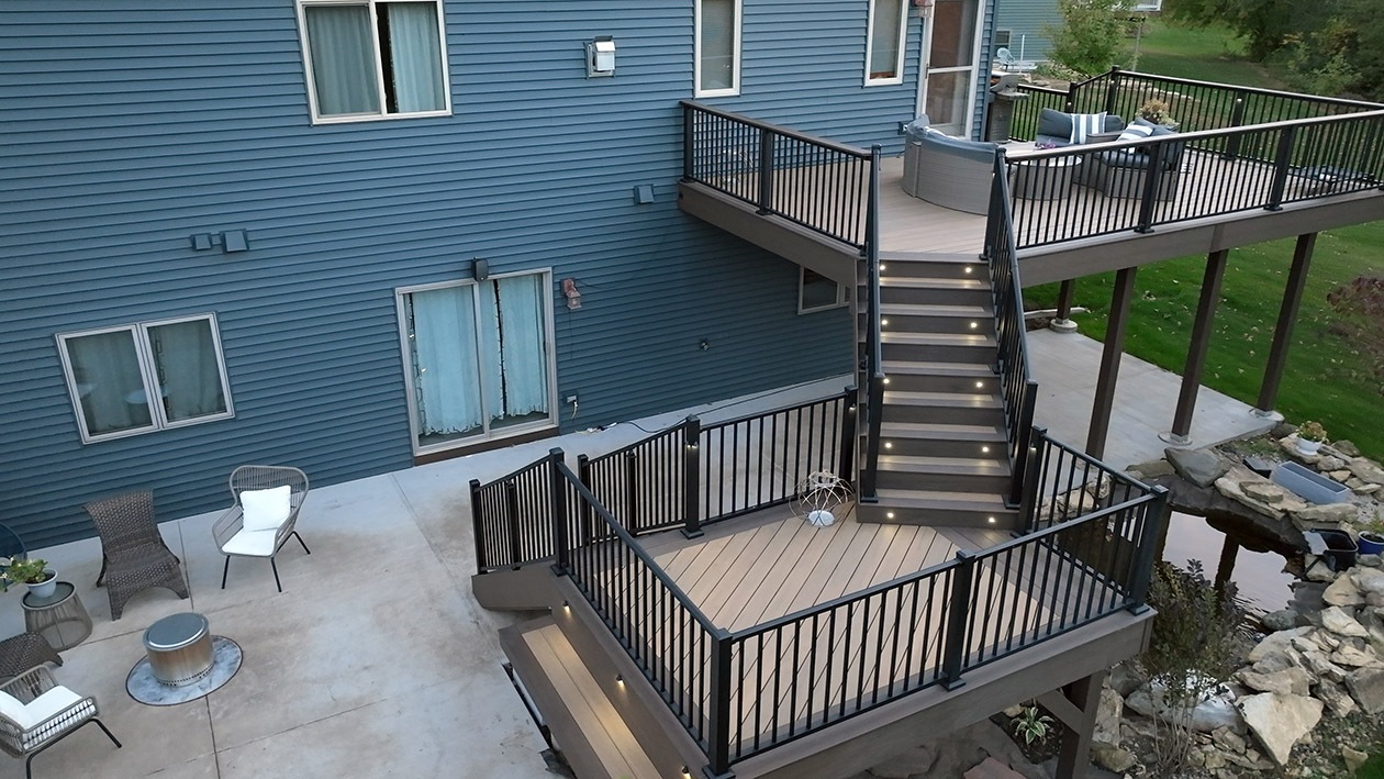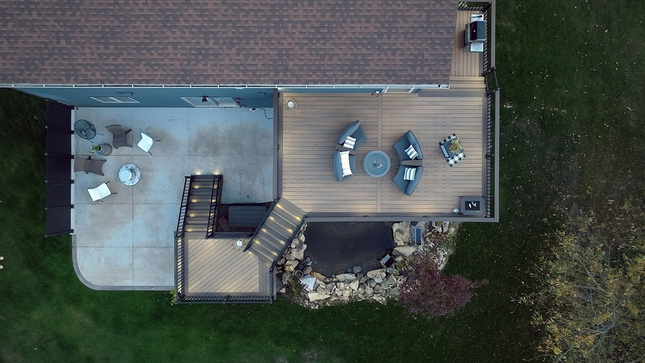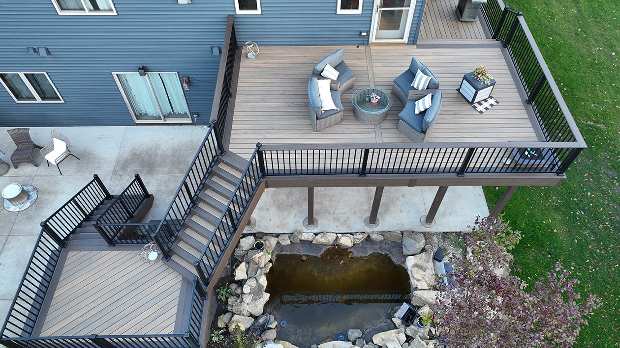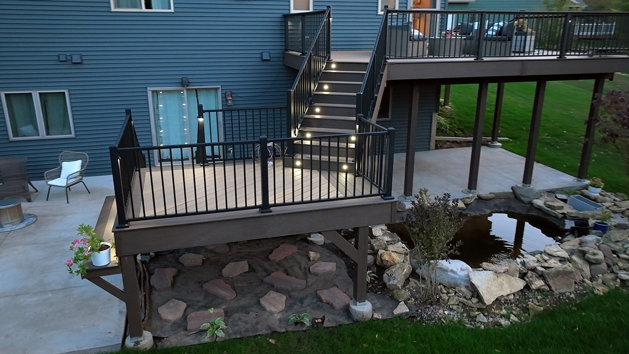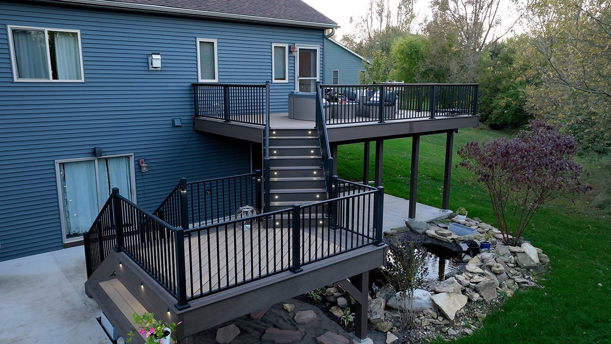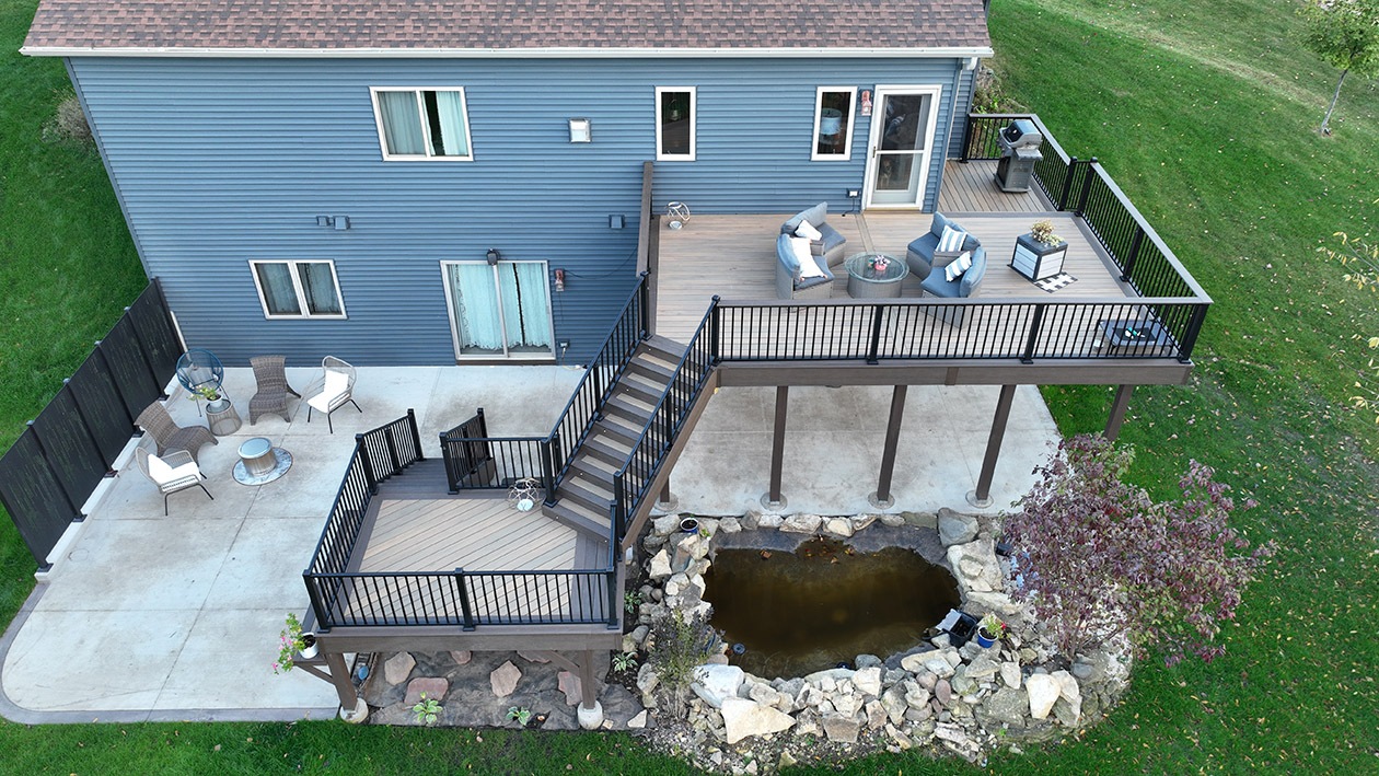 Near Rochester International Airport, this multi-tiered deck creates an amazing space for neighbor parties and family get togethers. This custom outdoor space features a large deck with a dedicated spaces for the grill and seating, a built in bar top, and a Hideaway screen-framed patio space.