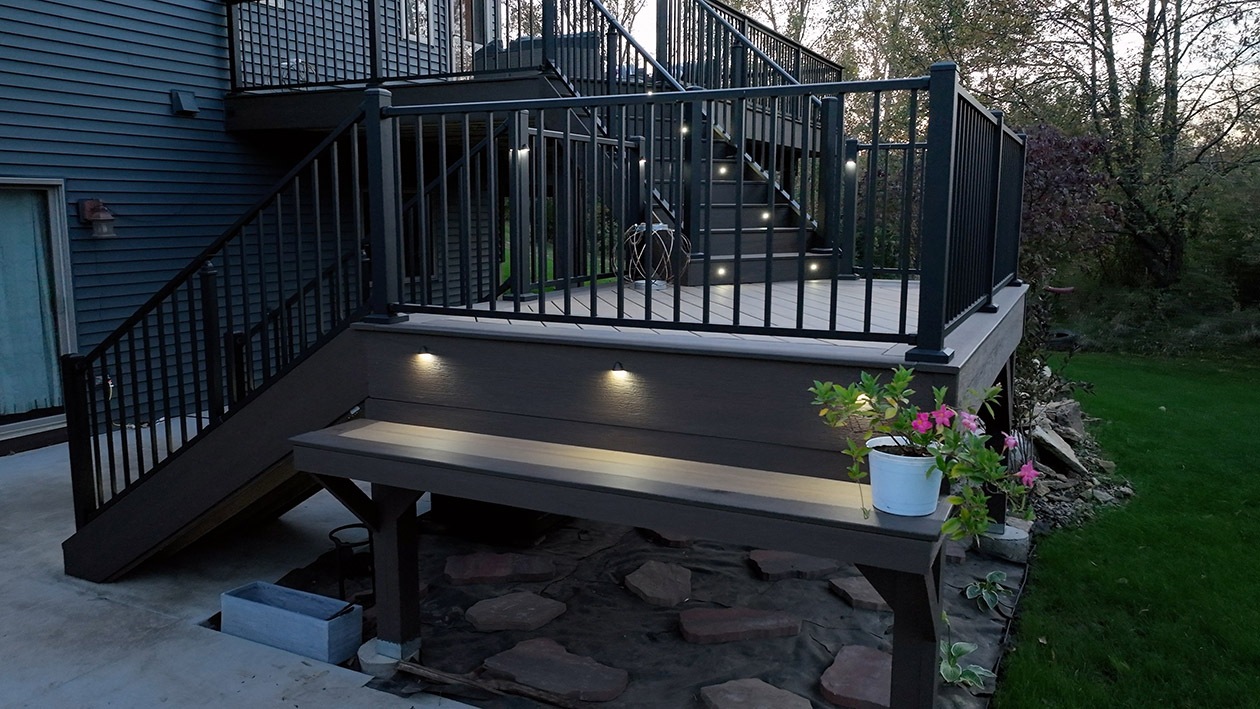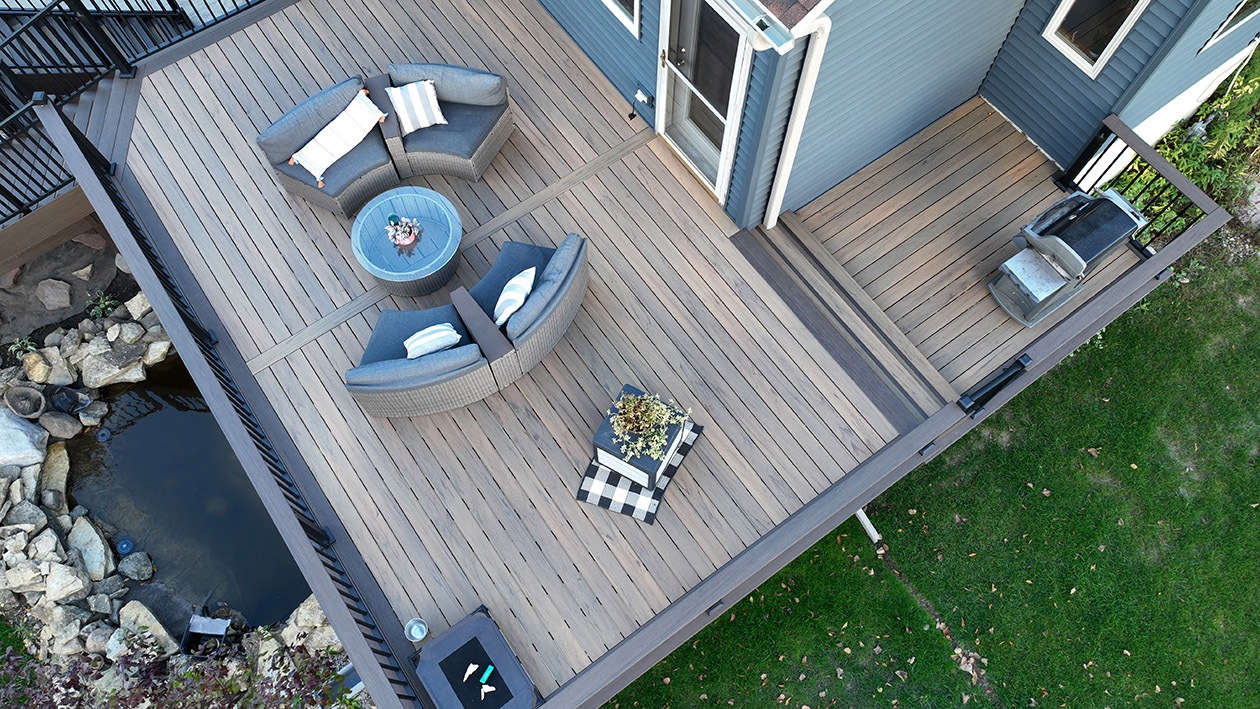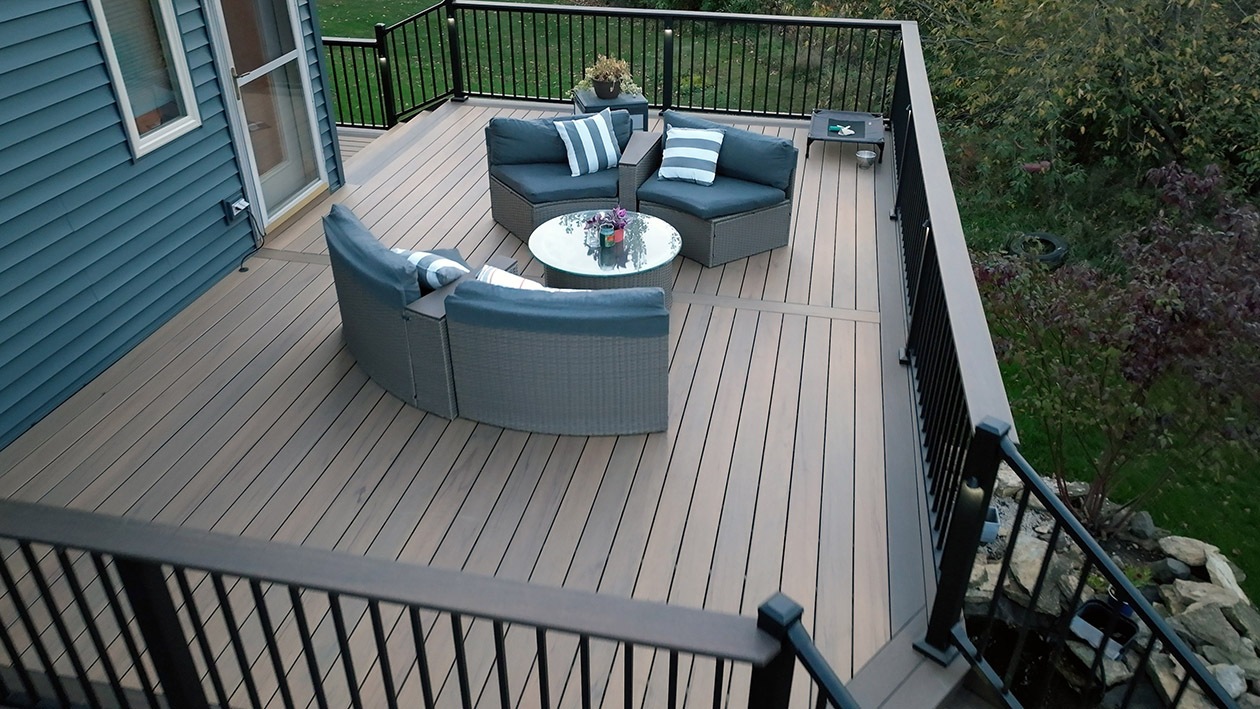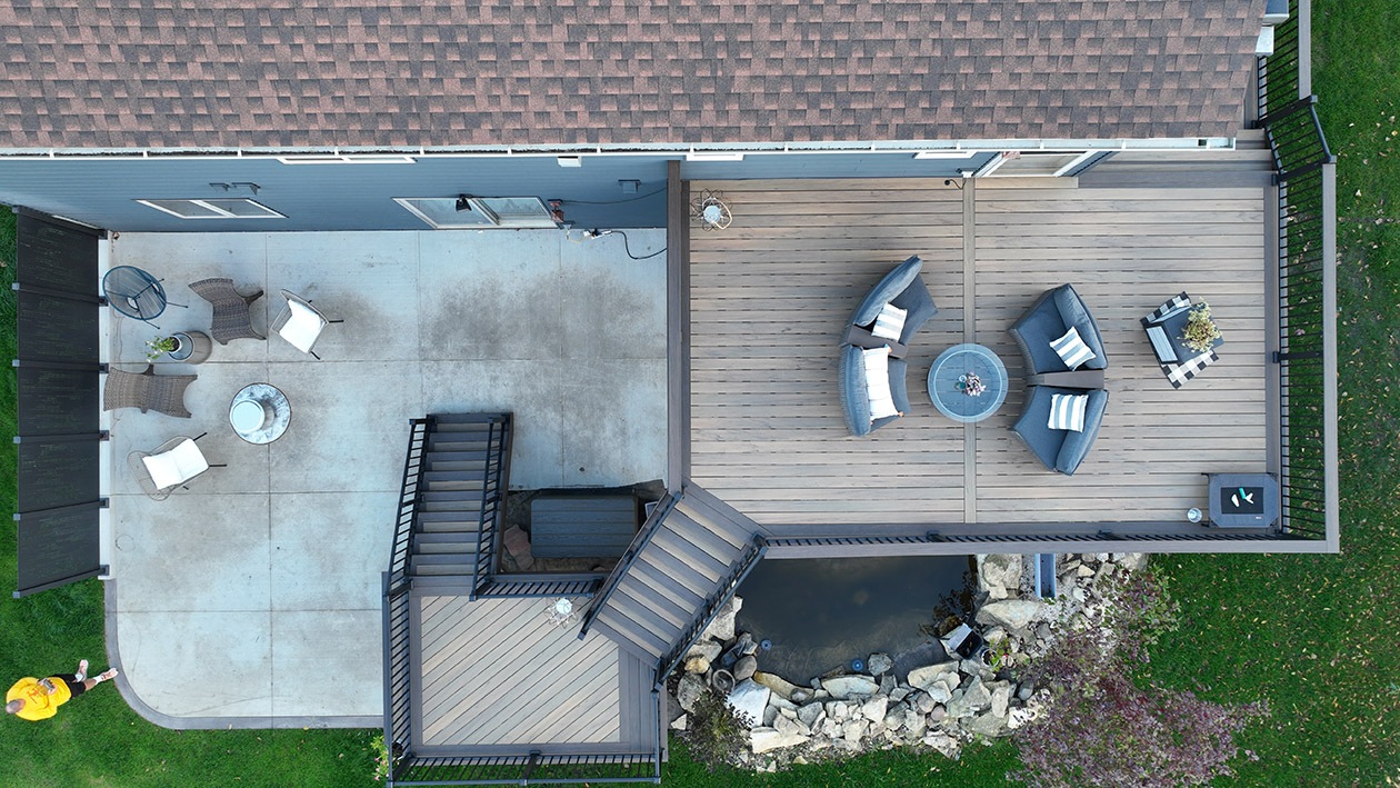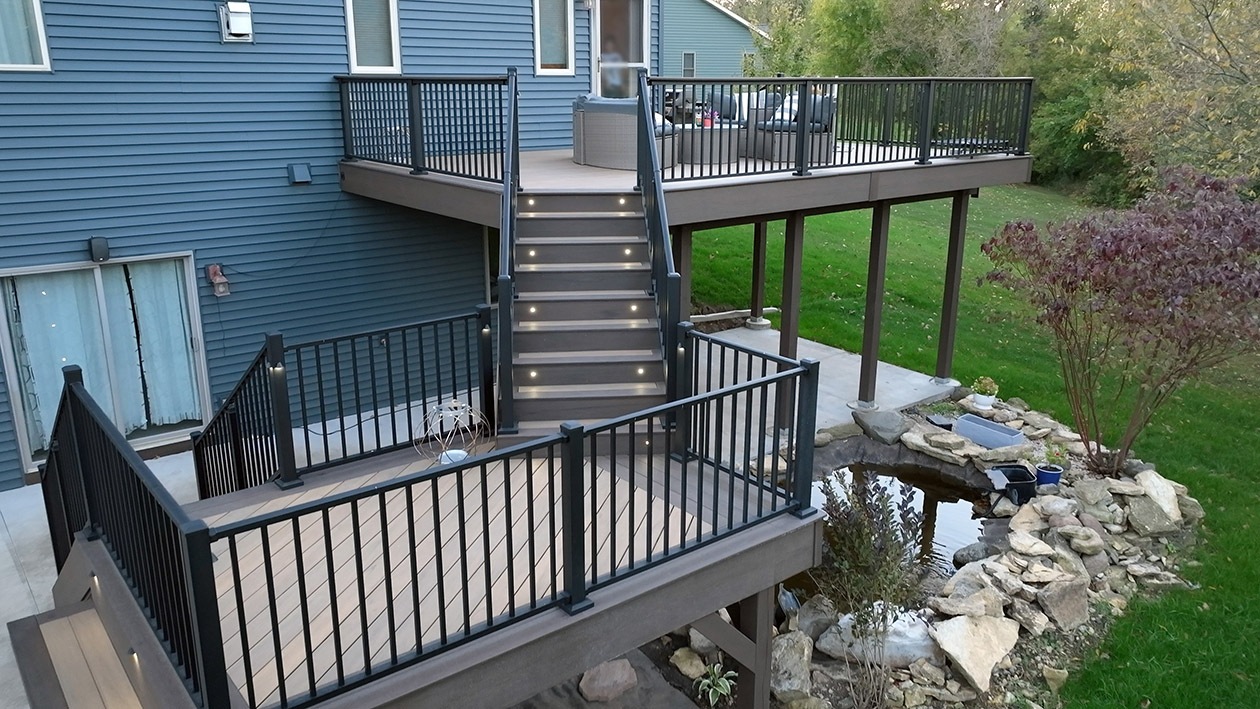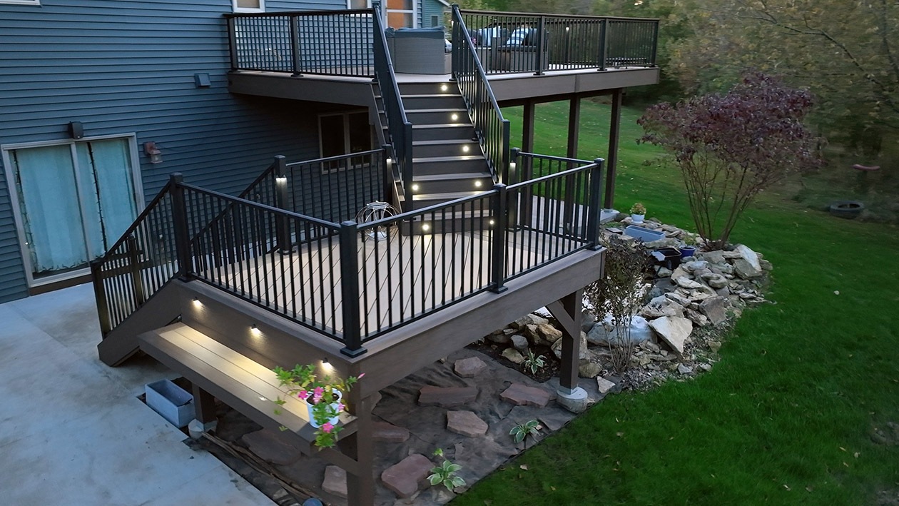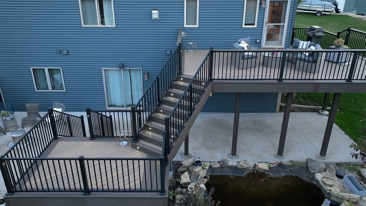 Near Rochester International Airport, this multi-tiered deck creates an amazing space for neighbor parties and family get togethers. This custom outdoor space features a large deck with a dedicated spaces for the grill and seating, a built in bar top, and a Hideaway screen-framed patio space.