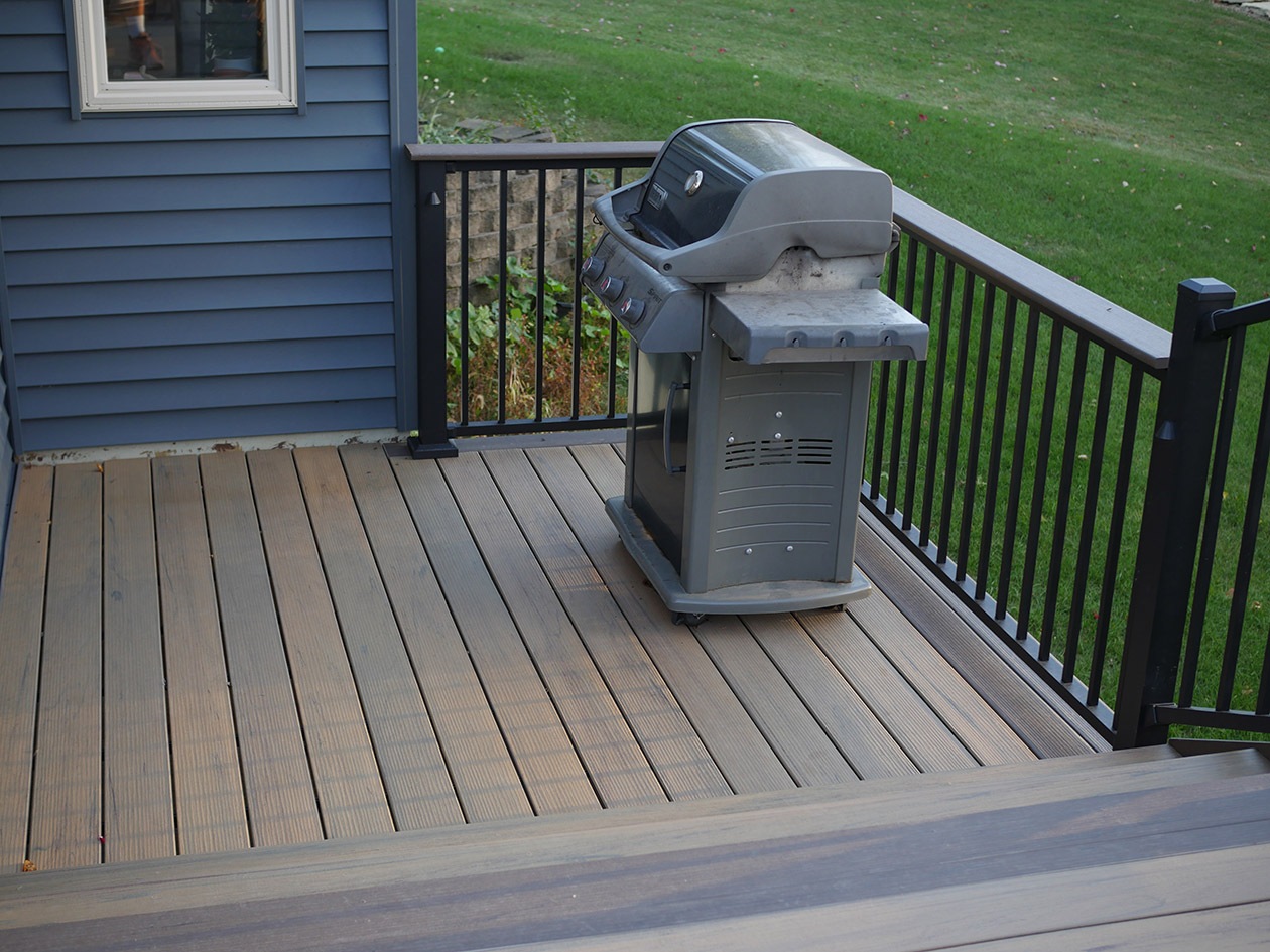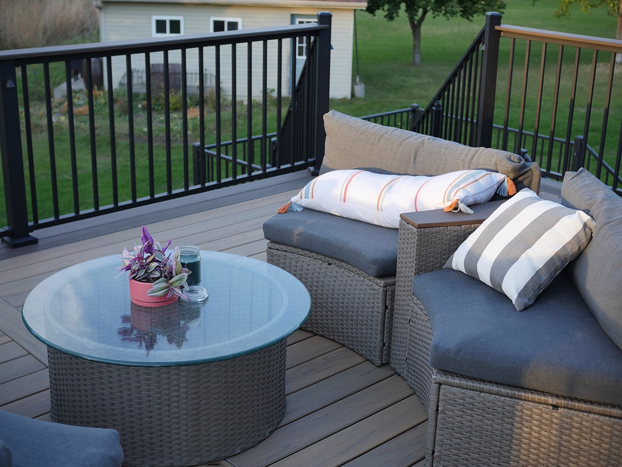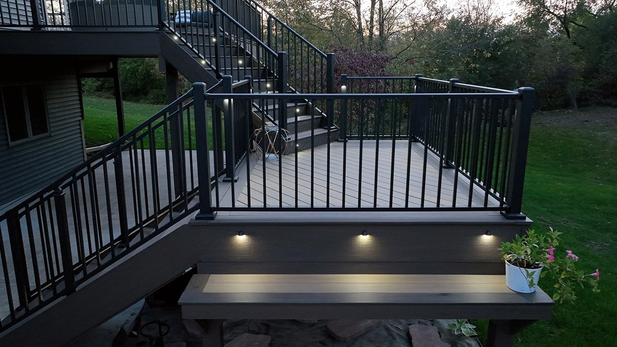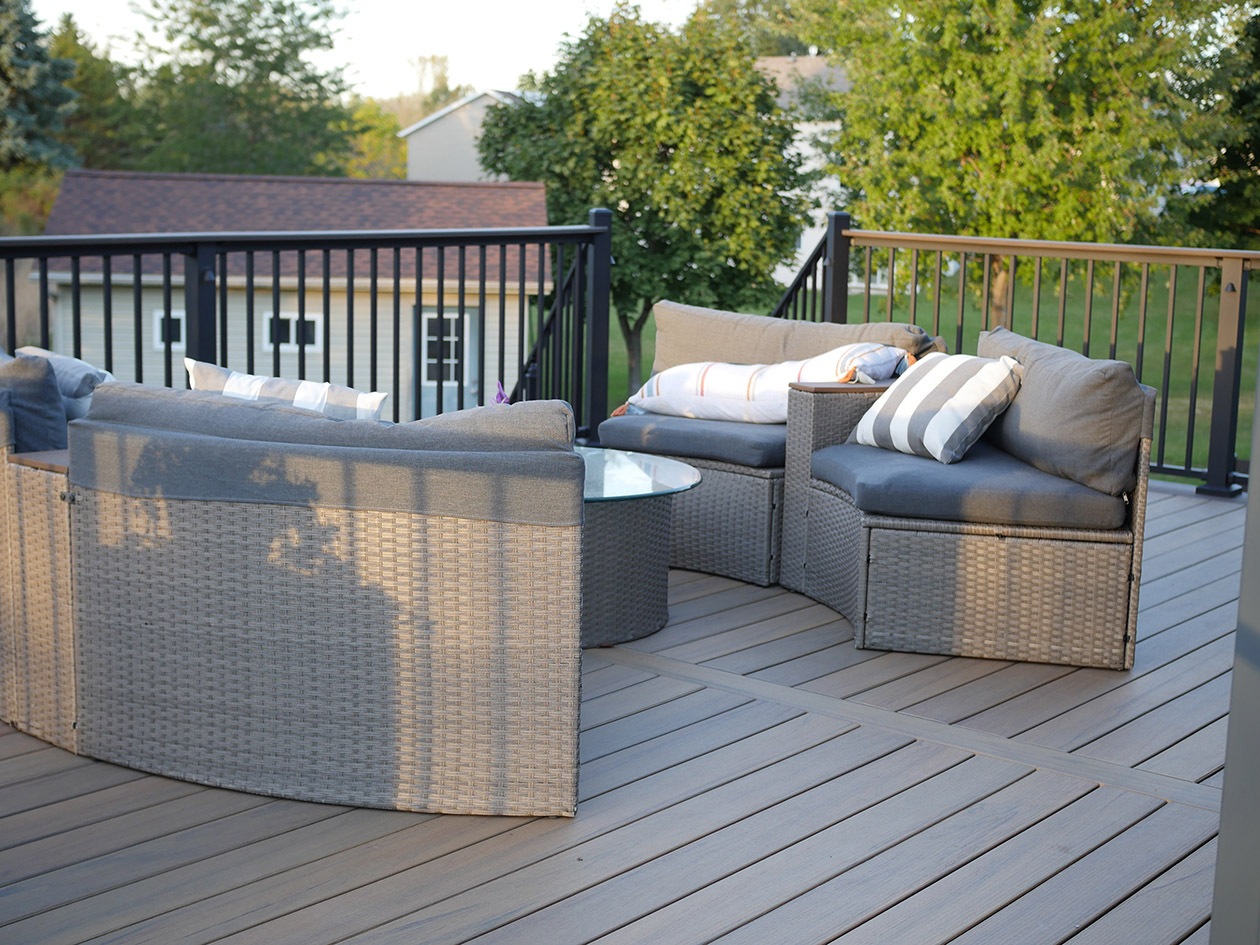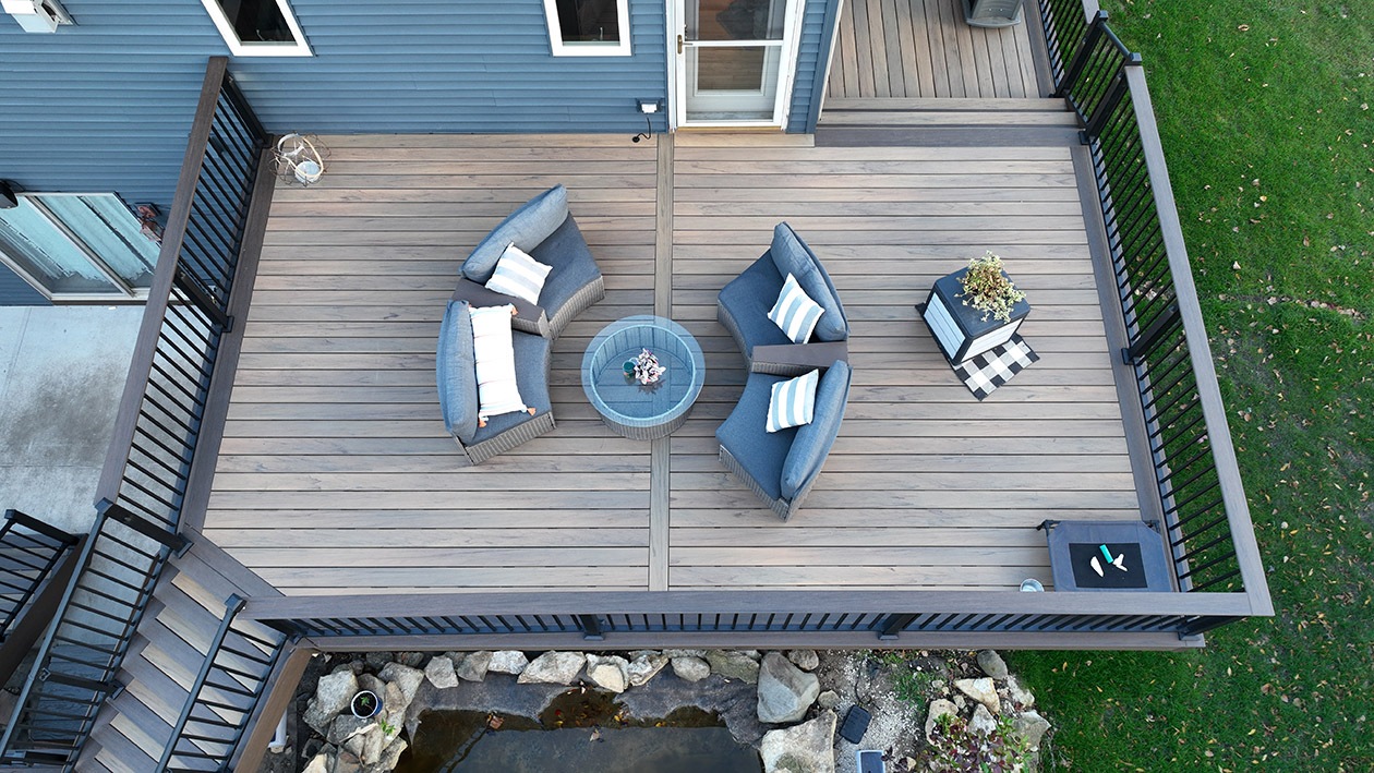 Near Rochester International Airport, this multi-tiered deck creates an amazing space for neighbor parties and family get togethers. This custom outdoor space features a large deck with a dedicated spaces for the grill and seating, a built in bar top, and a Hideaway screen-framed patio space.